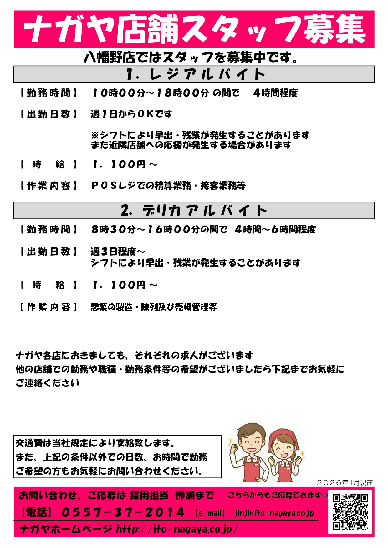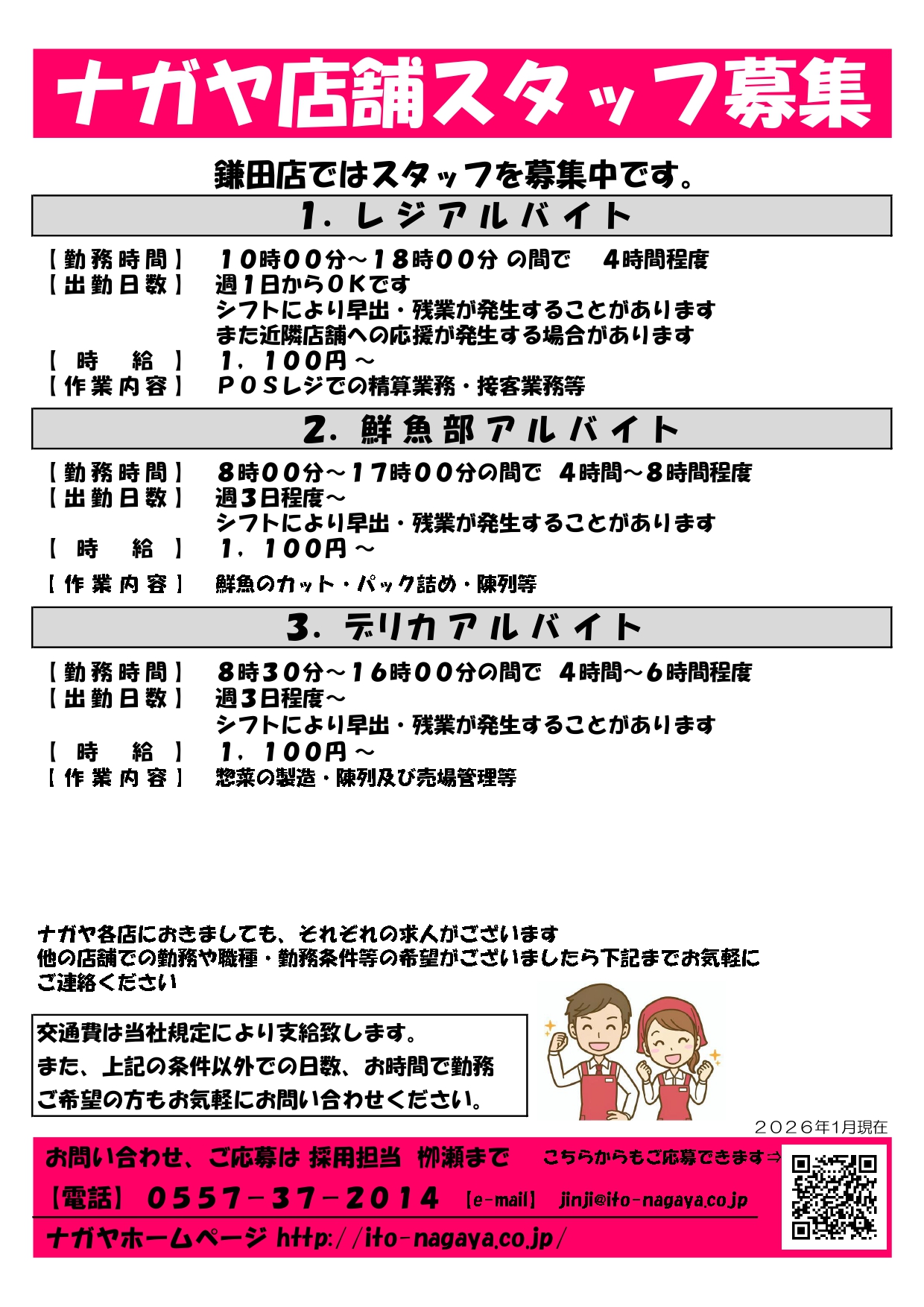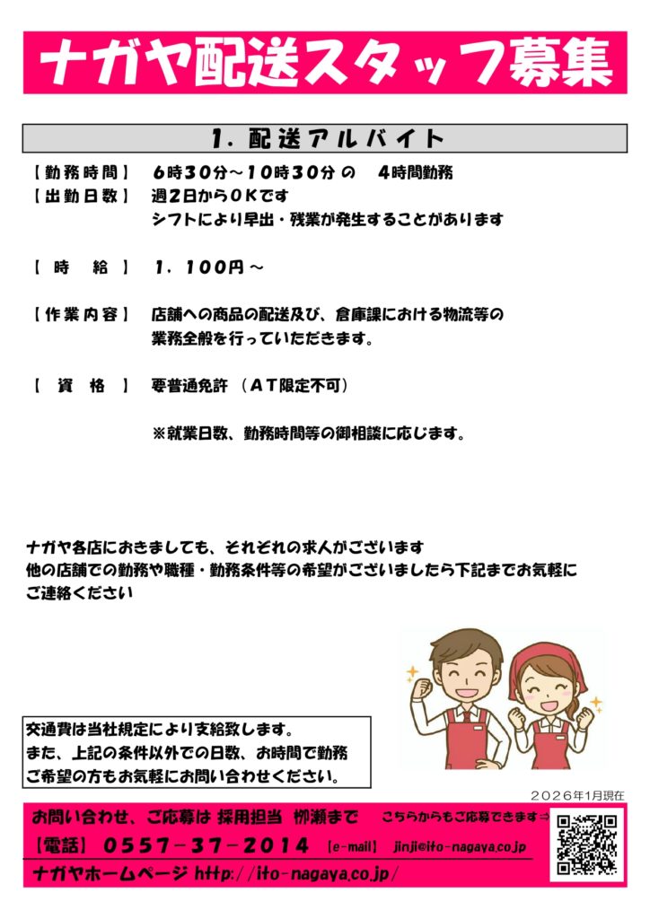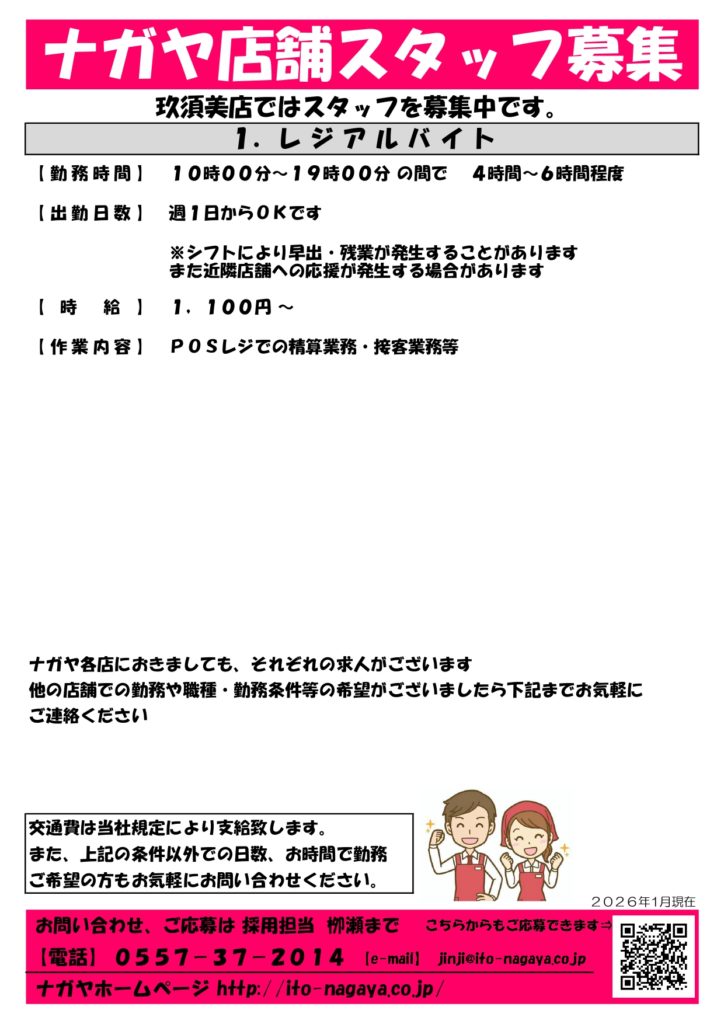 店舗スタッフ募集 募集内容(2026年1月) スタッフ募集チラシ(玖須美店) スタッフ募集チラシ(鎌田店) スタッフ募集チラシ(八幡野) スタッフ募集チラシ(桜田店) スタッフ募集チラシ(配送) 応募フォーム アルバイト/パート応募フォームはこちら
